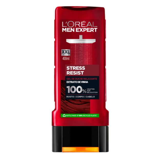 L'Oréal Men Expert Stress Resist Gel Duche tem uma base lavante fresca, com extrato de vinha e microcaptores, para uma ação de limpeza relaxante, revitalizante, suavizante e refrescante.