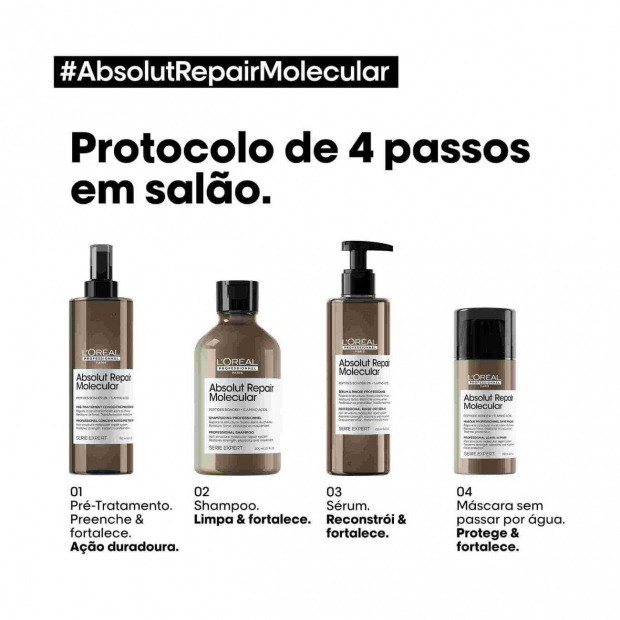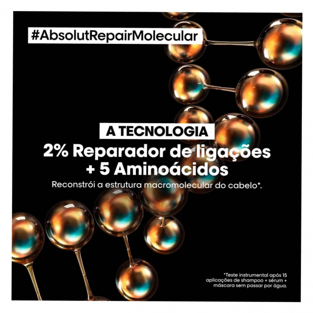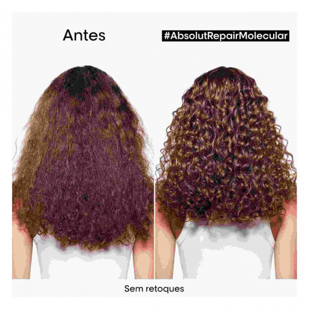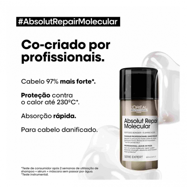 L’Oréal Professionnel Absolut Repair Molecular Máscara Leave-in tem uma textura leve que penetra instantaneamente e restaura a força original do cabelo.