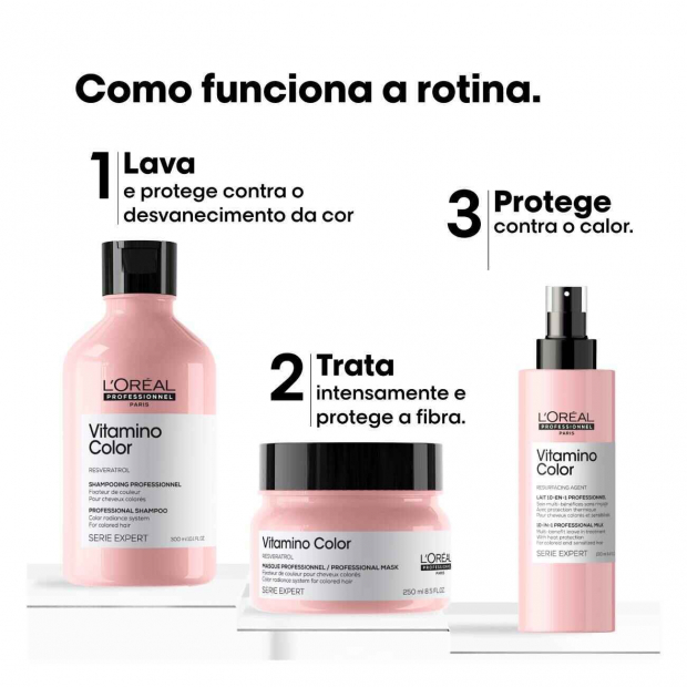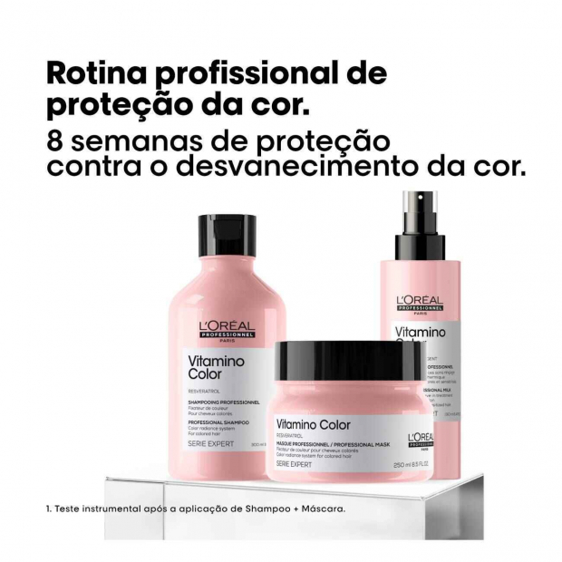 - L’Oréal Expert Professionnel Vitamino Color Shampoo que limpa suavemente o cabelo, enquanto protege a intensidade da coloração e diminui a quebra
