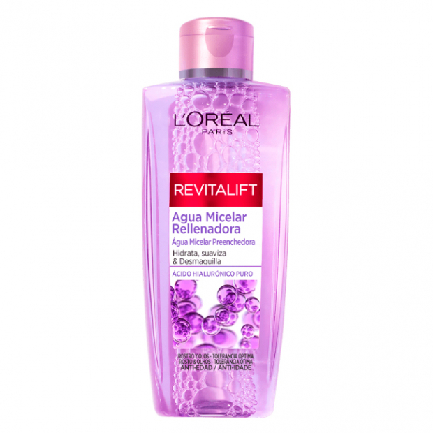 L'Oréal Revitalift Filler Água Micelar tem uma textura fluida, com uma combinação de ácido hialurónico puro e ácido hialurónico micrométrico, para uma ação de limpeza, anti-idade, preenchedora, hidratante e suavizante.