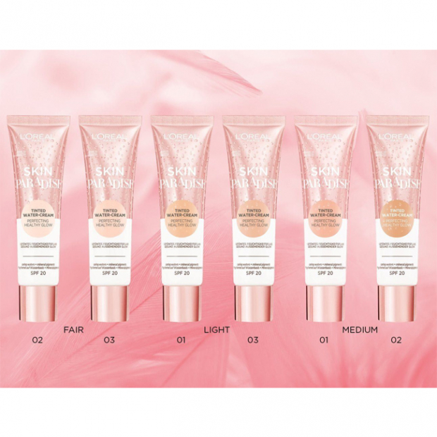 L'Oréal Skin Paradise Tinted Water-Cream Creme com Cor tem uma textura leve, que combina uma elevada concentração de águas de cuidado com aloé vera, filtros solares e pigmentos minerais, para uma ação hidratante, suavizante, protetora, aperfeiçoadora e iluminadora.