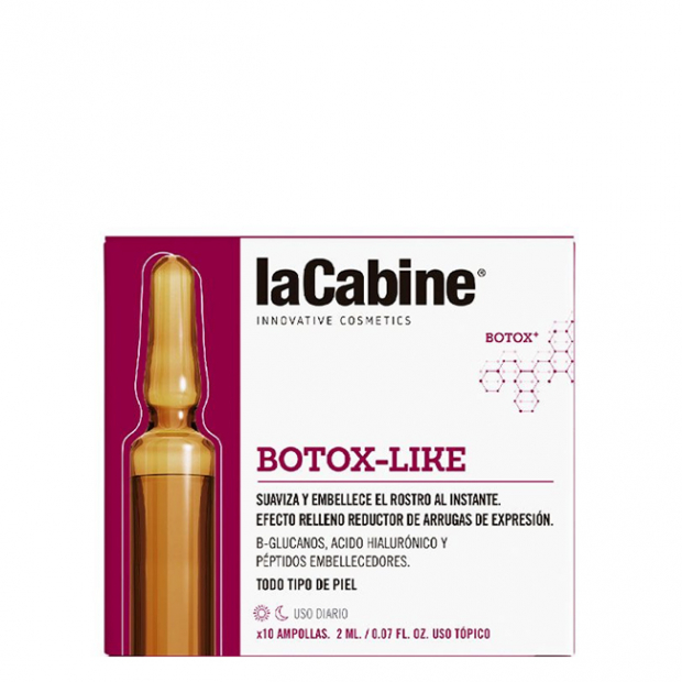 La Cabine Ampolas Botox-Like combina B-glicanos, ácido hialurónico e péptidos, para uma ação antienvelhecimento, suavizante e antirrugas.