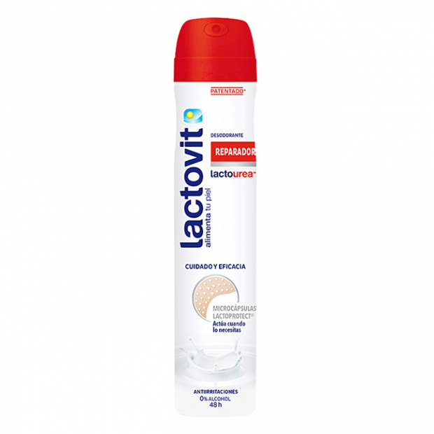 Lactovit Lactourea Reparador Desodorizante Spray combina microcápsulas Lactoprotect, agentes ativos de leite e ureia, para uma ação hidratante, reparadora, apaziguadora e protetora.