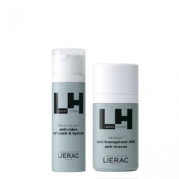 Para uma rotina simples e eficazes, no Lierac Homme Pack encontras o fluido antienvelhecimento global com ação antirrugas, refirmante e hidratante e o desodorizante.