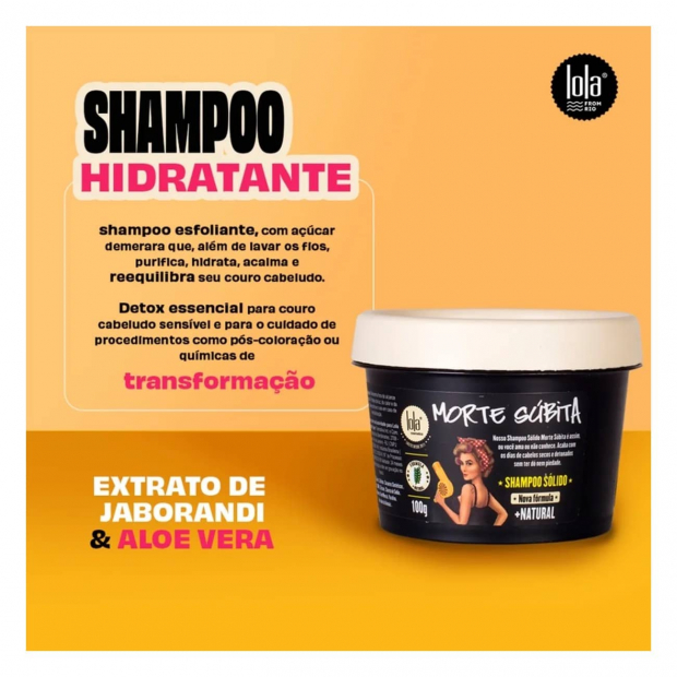 Lola Morte Súbita Shampoo Sólido Esfoliante contém açúcar granulado para uma ação esfoliante.