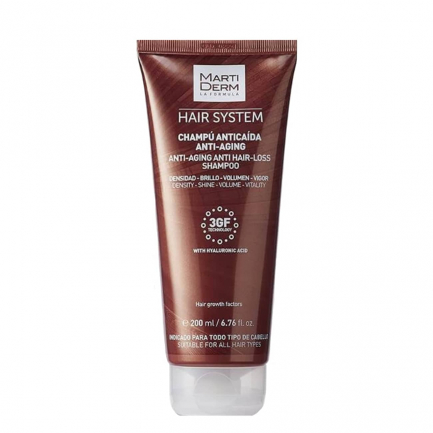 Martiderm Hair System 3GF Shampoo tem uma base lavante suave, com HGFx3 (IGF, VEGF e folistatina), biotinil, ácido oleanólico, apigenina, vitaminas, AA ricos em enxofre e ácido hialurónico, para uma ação de limpeza anti-queda, regenerante, anti-idade, estimulante, fortificante, redensificante e revitalizante. O cabelo fica perfeitamente limpo, mais denso, forte e volumoso.
