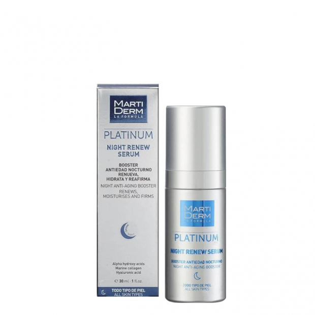 Martiderm Platinum Night Renew Sérum é um sérum de noite que estimula a regeneração celular, melhorando a firmeza e hidratação e prevenindo o envelhecimento, durante a noite.