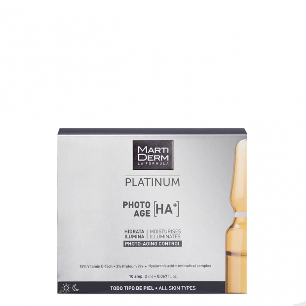 Martiderm Platinum Photo-Age HA+ Ampolas têm uma textura fluida de rápida absorção, com uma combinação de vitamina C-Tech (15%), Proteum 89+ (3%), ácido hialurónico, complexo antirradicalar e reparador, para uma ação hidratante, antioxidante, regeneradora, reafirmante, alisante e iluminadora.