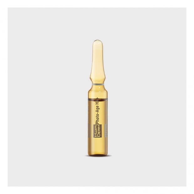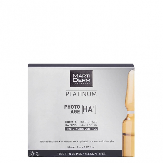 Martiderm Platinum Photo-Age HA+ Ampolas têm uma textura fluida de rápida absorção, com uma combinação de vitamina C-Tech (15%), Proteum 89+ (3%), ácido hialurónico, complexo antirradicalar e reparador, para uma ação hidratante, antioxidante, regeneradora, reafirmante, alisante e iluminadora.