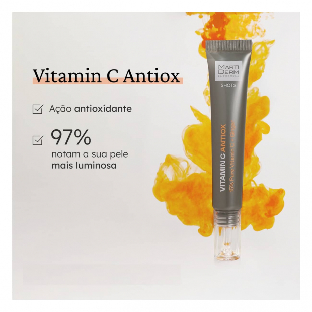Martiderm Shots é o novo nome dos teus séruns favoritos! Com 5 shots para 5 necessidades diferentes, o Martiderm Shots Vitamina C Antiox é um sérum altamente concentrado em vitamina C que proporciona um efeito antioxidante intenso.