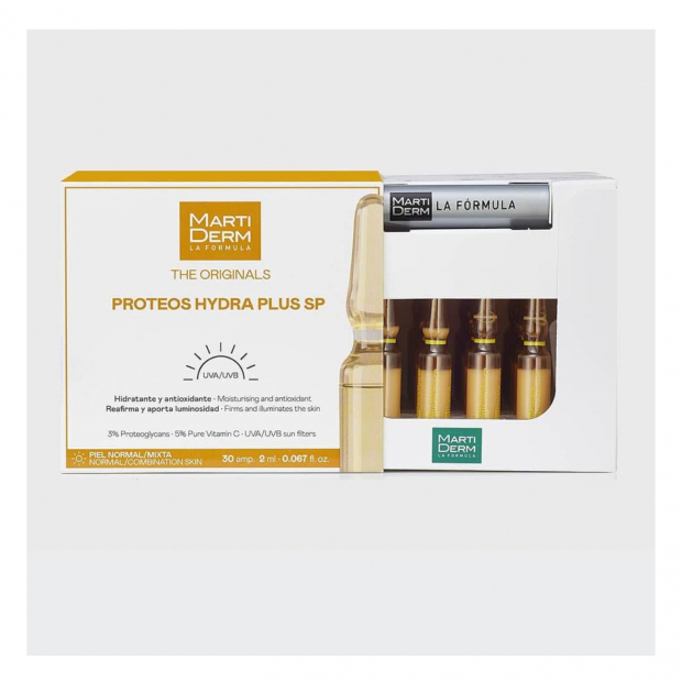 Martiderm The Originals Proteos Hydra Plus SP são ampolas, que ajudam a proporcionar hidratação intensa, enquanto protegem e iluminam a tez. Hidratam profundamente, sem sensação oleosa. Mantêm a hidratação ao longo do dia. Melhoram a firmeza natural. Reparam o tecido conjuntivo, enquanto atenuam as manchas. Previnem os danos causados pelas agressões externas diárias. Protegem contra os raios UV. De rápida absorção. Ideal para pele normal a mista.