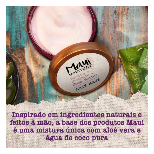 Maui Moisture Shea Butter Máscara Cabelos Secos Danificados tem uma textura rica e cremosa e uma fórmula vegan baseada em produtos naturais ideais para combater a secura.