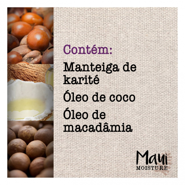 - Contém manteiga de karité, coco e óleo de macadâmia para hidratar, nutrir e suavizar o cabelo