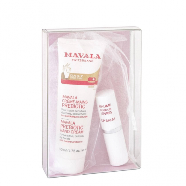 Kit que contém 1 Mavala Creme Prebiotic (50ml) e 1 Mavala Bálsamo Labial (4.5g) para ajudar na secura das mãos e lábios.