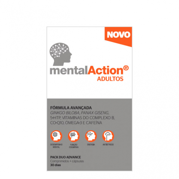 MentalAction Adultos Multivitamínico é um suplemento alimentar em comprimidos e cápsulas, com ácido pantoténico, DHA, ferro, zinco, vitaminas do tipo B (B1, B3, B6, B8 e B12) e C que favorece o desempenho mental, a função cognitiva, melhora o metabolismo e diminui o stress.