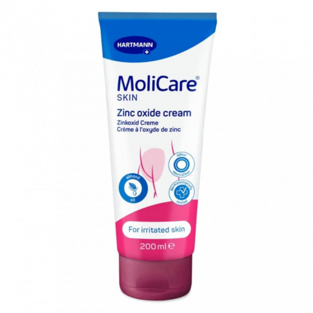 Molicare Skin Creme de Óxido Zinco é um creme que ajuda proteger a zona íntima. Cria uma barreira de proteção. Proporciona uma proteção avançada contra infeção, maceração e desidratação. Equilibra e fortalece a barreira cutânea. Neutraliza os odores. Não compromete a capacidade dos produtos absorventes. Ideal para pele madura, irritada, devido a situações de incontinência ou repouso prolongado.