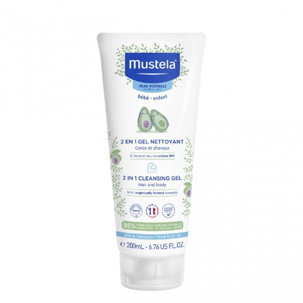 Mustela Bebé Gel 2 em 1 Corpo e Cabelo é um gel lavante sem sabão que limpa a pele e lava o cabelo do bebé sem irritar o couro cabeludo.