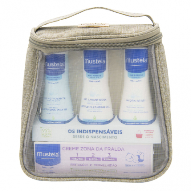 Mustela Bebé Kit Indispensáveis é um kit com cuidados essenciais para bebé: 1 Creme Muda Fralda (100ml), 1 Gel Lavante Suave (100ml), 1 Leite Corporal (100ml) e 1 Água de Limpeza (100ml). Oferta de bolsa taupe.