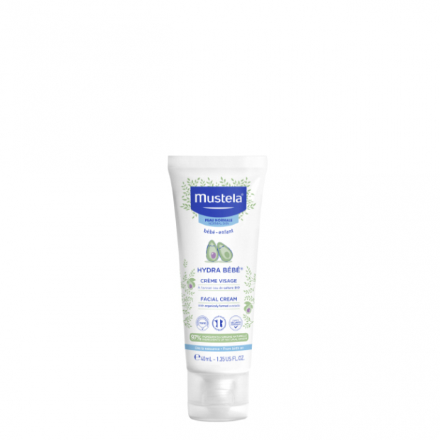 Mustela Hydra Bebé Creme de Rosto tem uma textura cremosa, com uma combinação de 97% de ativos naturais: extrato perséose de abacate que preserva a riqueza celular e Stelaskin®, para uma ação hidratante, suavizante e fortificante.