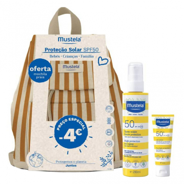 Pack de cuidados solares com spray e leite de proteção elevada, com oferta de mochila amarela. Indicado para toda a família.