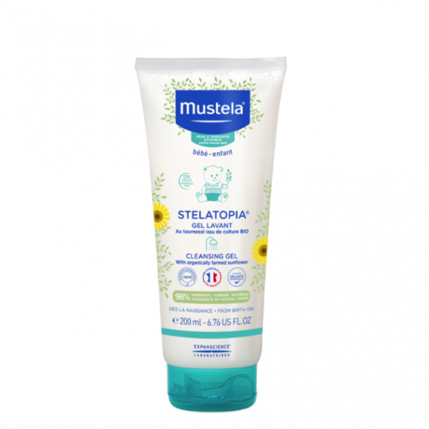 Mustela Stelatopia Gel Lavante tem uma base lavante suave, com pH fisiológico, para uma ação de limpeza suave, calmante, hidratante, protetora e suavizante.