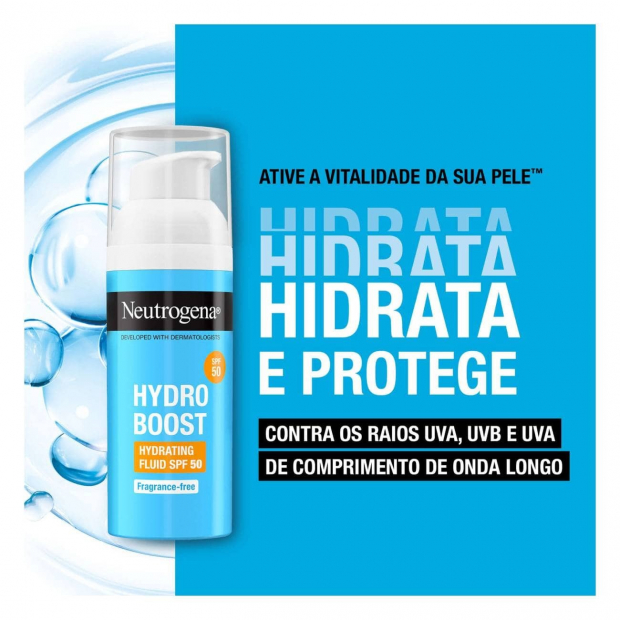 Aplica Neutrogena Hydro Boost Fluido SPF50 de manhã e reaplica sempre que necessário.