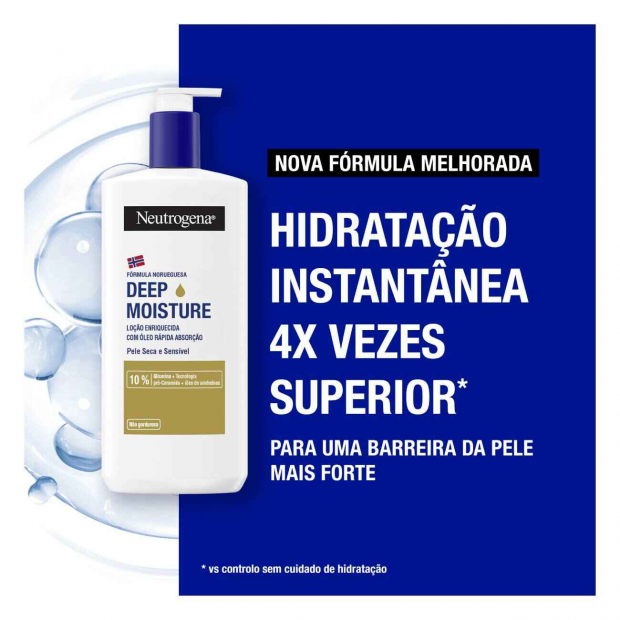 Aplica Neutrogena Hidratação Profunda Loção-Óleo de manhã e à noite, na pele do corpo, limpa e seca, com uma massagem suave.