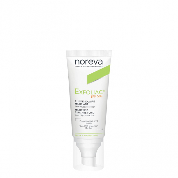 Noreva Exfoliac SPF50+ Fluido é um fluido solar, que ajuda a hidratar, com efeito mate, a pele, enquanto protege contra os raios solares. Hidrata suavemente, sem sensação oleosa. Absorve o excesso de oleosidade, eliminando o brilho. Proporciona proteção solar muito elevada (FPS50+). Ideal para pele oleosa, com tendência acneica.