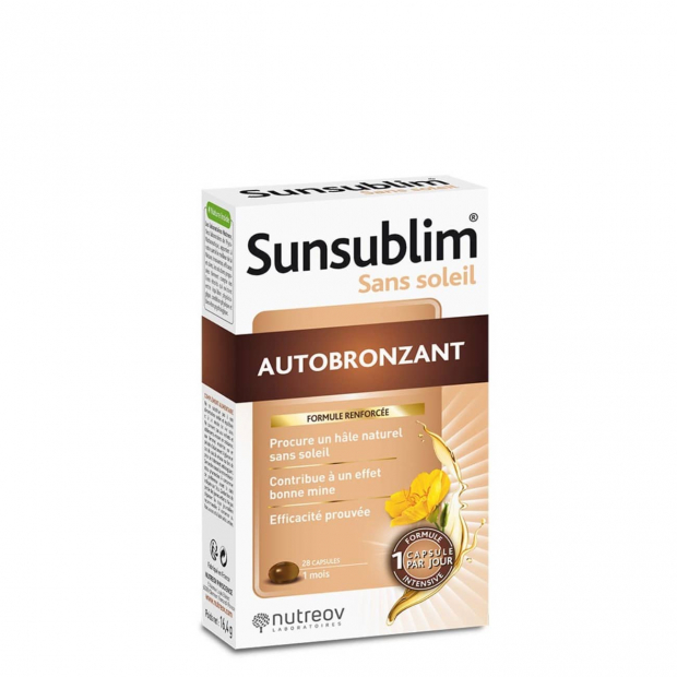 Nutreov Sunsublim Autobronzeador é um suplemento alimentar em cápsulas, com uma combinação de carotenóides, cobre e vitaminas C e E, para uma ação bronzeadora, antioxidante e fortificante.