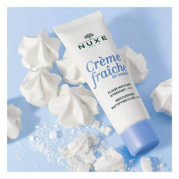 Nuxe Crème Fraîche de Beauté Fluido Matificante tem uma textura ultraleve, fresca e de rápida absorção, com uma fórmula que contém 96% de ingredientes de origem natural.