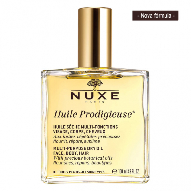 Nuxe Huile Prodigieuse é um óleo seco que ajuda a nutrir, reparar e proteger a pele e o cabelo. Este cuidado nº1 apresenta uma nova fórmula enriquecida com óleo de Tsubaki para uma nutrição ainda mais intensa. Suaviza e nutre profundamente, sem sensação oleosa. Não mancha e contém antioxidantes que protegem a pele. Atenua a aparência das estrias. É indicado para todo o tipo de pele e cabelo. Feito à base de ativos naturais, sem conservantes, sem matérias e sem parabenos. Não bloqueia os poros. Fragrância floral suave com notas de borragem, hipericão, amêndoas doces, camélia, avelã e macadâmia.
