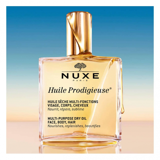 É impossível ser indiferente ao Nuxe Huile Prodigieuse, um óleo seco multifunções que nutre o rosto, corpo e cabelo.