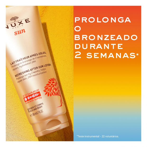 Nuxe Sun Leite Pós-Solar resulta da combinação de ingredientes naturais: água de flores e pó de alfarroba para uma ação hidratante prolongada, regeneradora e matificante para uma pele hidratada, apaziguada, confortada e com um bronzeado duradouro e sublime.