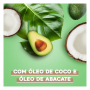 - Óleo de coco, óleo de abacate e manteiga de cacau para nutrir, disciplinar e devolver o brilho ao cabelo