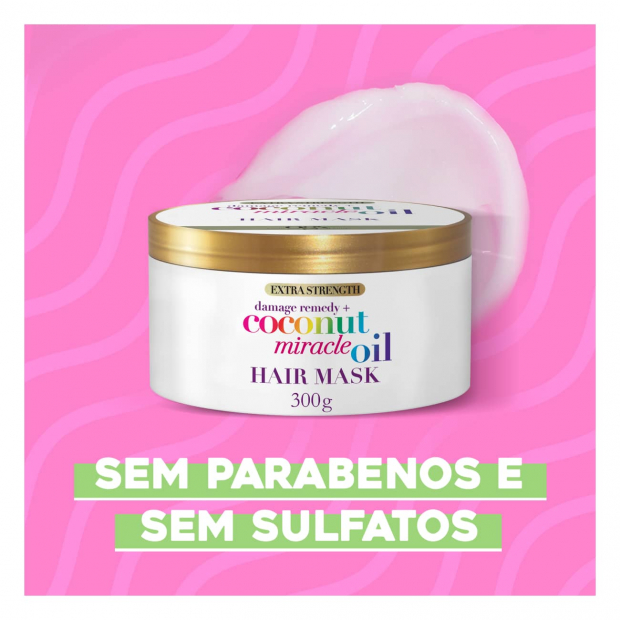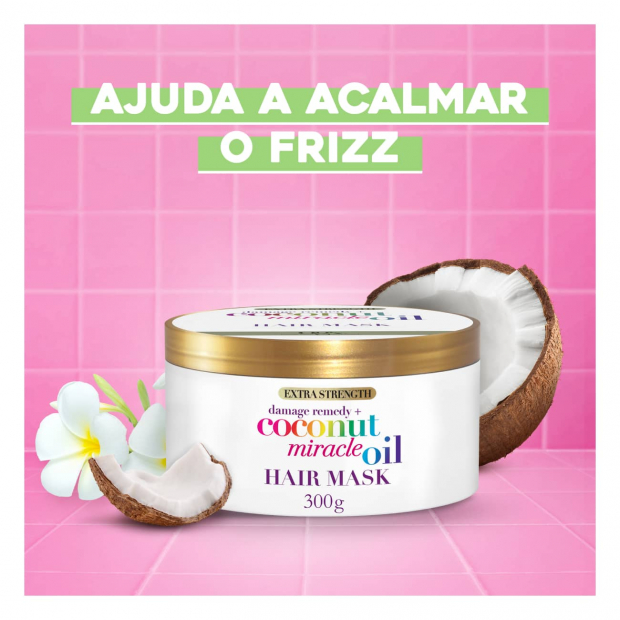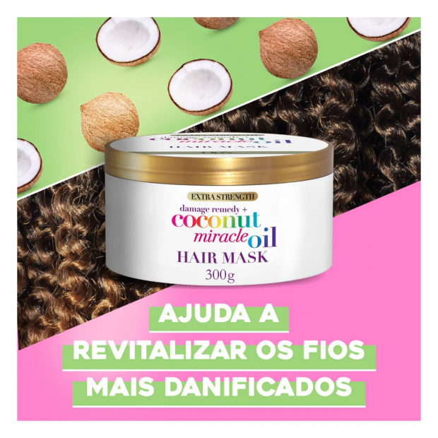 OGX Damage Remedy Coconut Miracle Oil Máscara tem um textura rica, uma fragrância deliciosa a coco, tangerina e baunilha e uma combinação de ingredientes poderosos naturalmente reparadores.