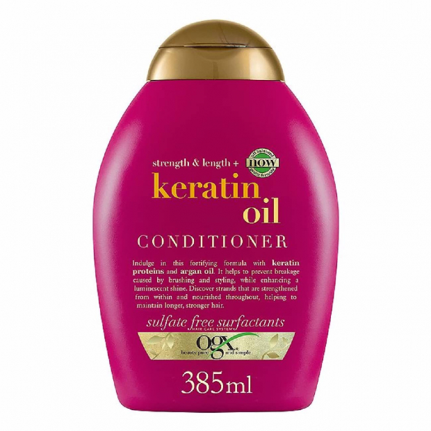 Se tens o cabelo danificado e fragilizado, OGX Strength and Length Keratin Oil Anti-Breakage Conditioner fortalece os cabelos para que não quebrem ao pentear.