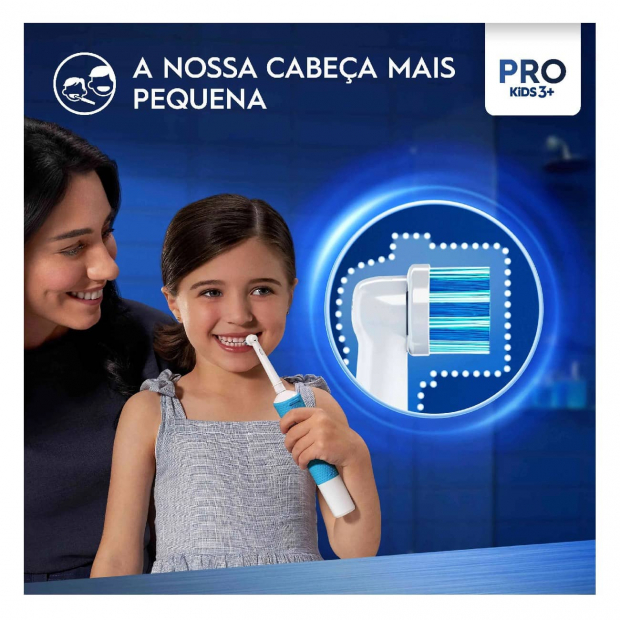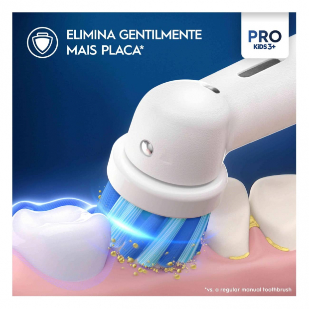 Oral-B Pro Kids 3+ Frozen tem um formato mais pequeno, arredondado e com cerdas suaves para permitir uma limpeza mais eficaz, sem magoar.