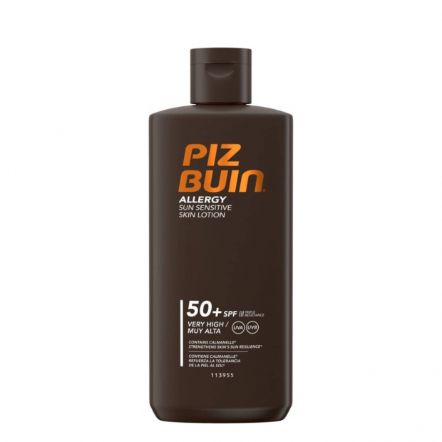 Piz Buin Allergy SPF50+ é uma loção solar que hidrata, enquanto protege e suaviza a pele sensível ao sol. Também ajuda a prevenir a descamação da pele sensível.