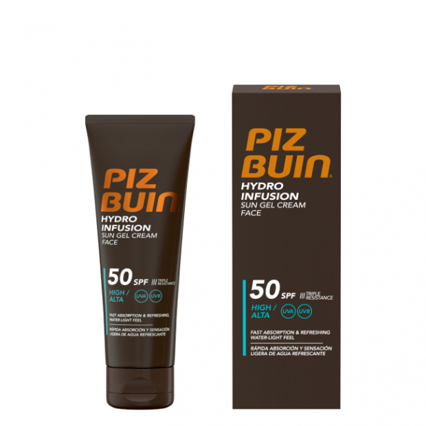 Piz Buin Hydro Infusion SPF50 Gel Creme tem uma textura em gel-creme fundente e fresca, com uma combinação de filtros anti-UV inovadores Triple Resistence® para uma ação protetora, refrescante, hidratante, antioxidante e suavizante.