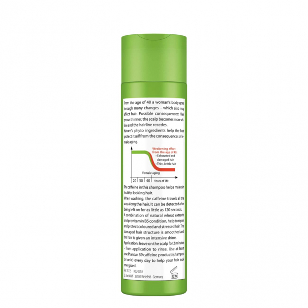Plantur 39 Shampoo Cafeína é um shampoo fortificante anti-queda que ajuda a limpar suavemente, impedir a queda prematura e manter a coloração do cabelo. Lava suavemente e fortifica. Previne a queda prematura e o desvanescimento precoce da cor. Protege os folículos capilares. Ideal para cabelo pintado, com tendência para queda e para mulheres após a menopausa.