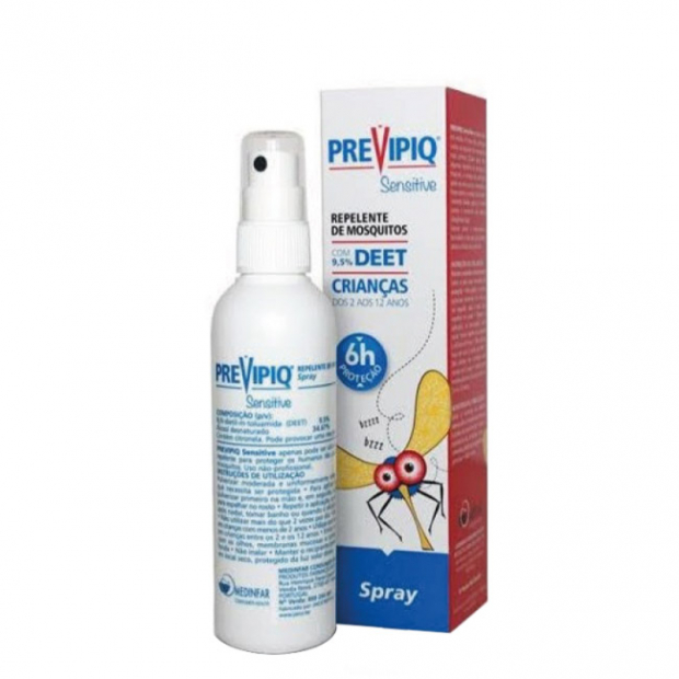 Previpiq Sensitive Spray Crianças Repelente de Mosquitos tem um fórmula suave, com 9,5% de DEET (N,N-dietilmetatoluamida), para uma ação protetora e repelente contra mosquitos (europeus e tropicais), insetos (tropicais), moscas e moscardos.