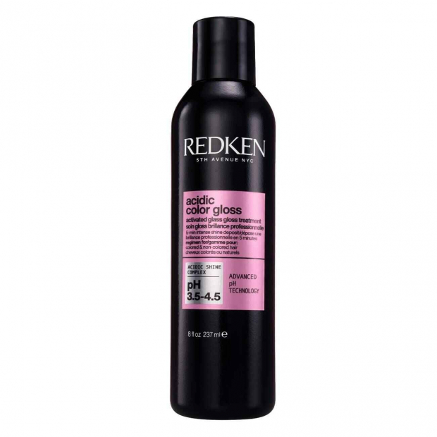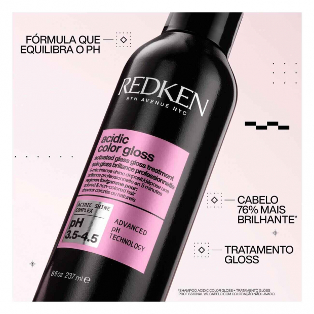 Redken Tratamento Gloss Profissional Acidic Color Gloss apresenta uma textura cremosa e uma fórmula com Acidic Shine Complex e Tecnologia pH Avançada
