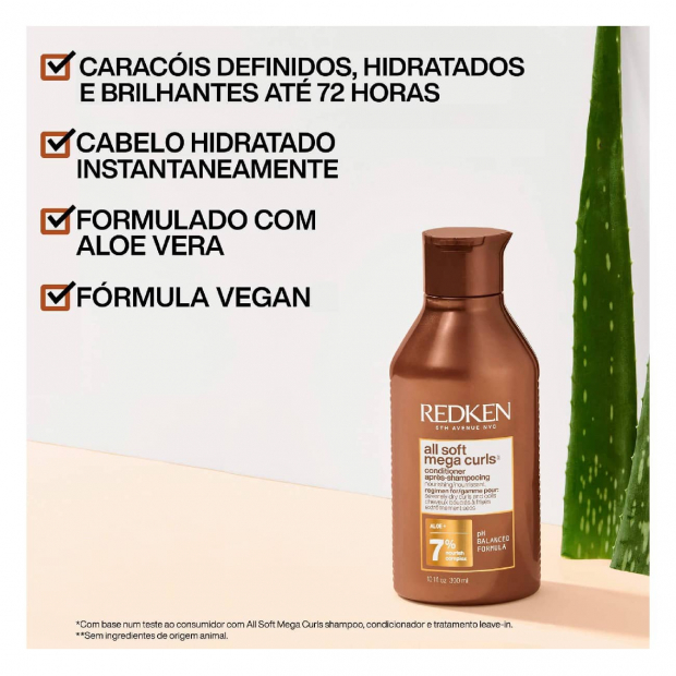 Redken All Soft Mega Curls Condicionador tem uma textura cremosa e uma fórmula vegan com pH equilibrado.