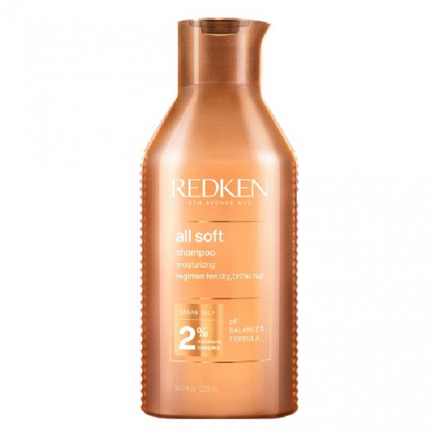 Redken All Soft Shampoo tem uma textura cremosa, com base lavante suave, complexo de proteína RCT, óleo de argão, proteína de soja, arginina, sepicap e fator emoliente, para uma ação de limpeza nutritiva, reestruturante, regenerante, suavizante e flexibilizante.