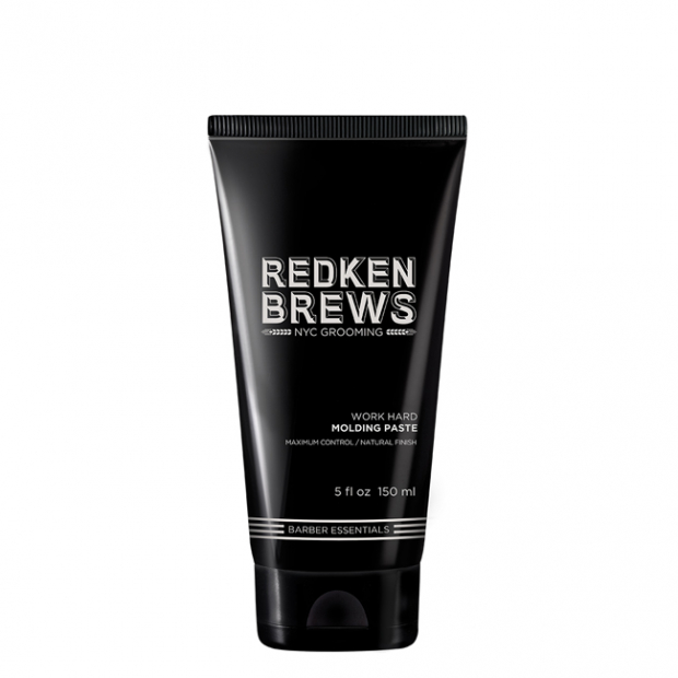 Redken Brews Work Hard Pasta Modeladora tem uma fórmula não oleosa, com fibras de poliestireno, para uma ação de fixação flexível.