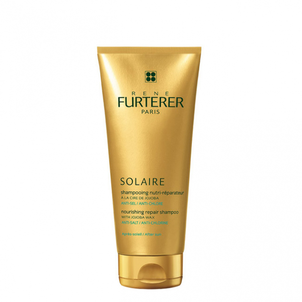 Rene Furterer Solaire Shampoo Nutri-Reparador é formulado com cimentrio e fosfolípidos que ajudam a restaurar e reparar os cabelos desidratados/agredidos. Contém cera de jojoba pelas suas propriedades nutritivas e reparadoras. Este shampoo é biodegradável (pode ser emulsionado com água do mar), conforme a norma internacional OCDE 301B. Formulado com activos 100% naturais.