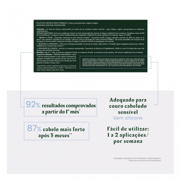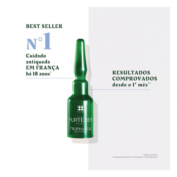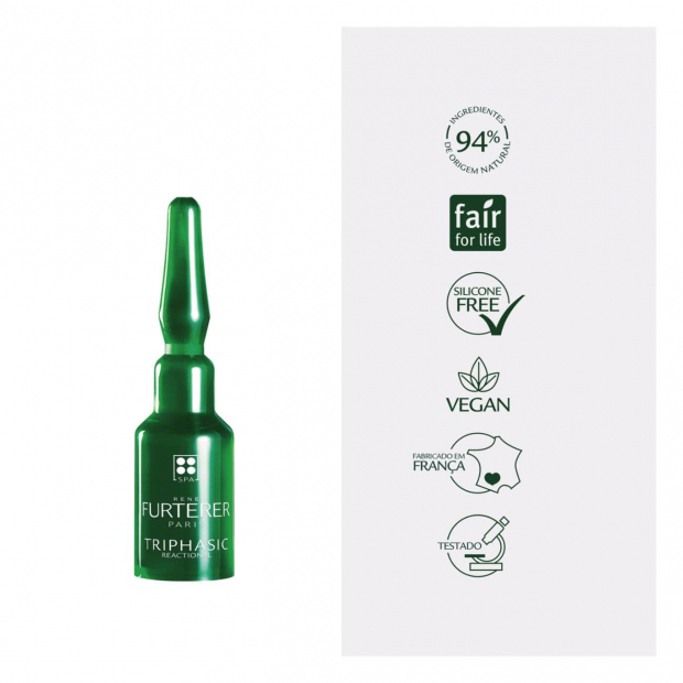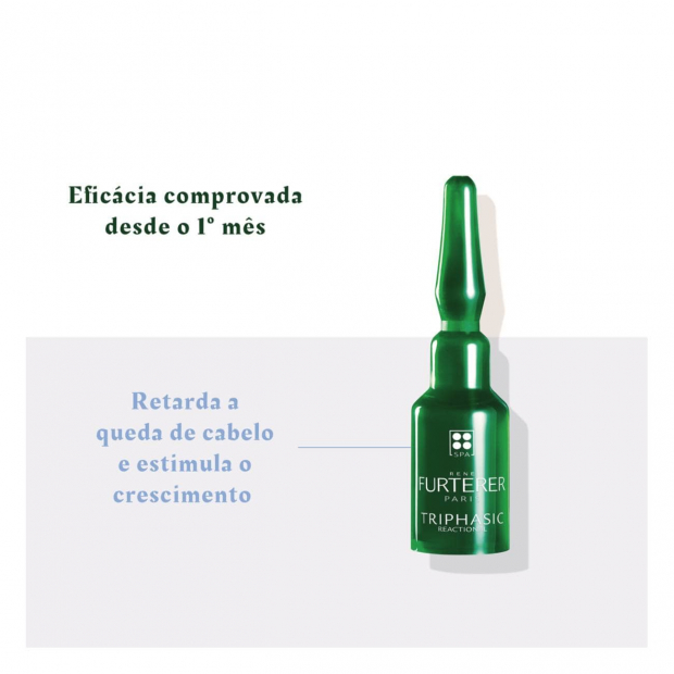 Rene Furterer Triphasic Ampolas Antiqueda Reacional tem uma fórmula à base de Extrato de Pfafia, Complexo Mineral de Lótus e Óleo Essencial de Limão para reequilibrar o couro cabeludo e incentivar um crescimento capilar saudável.