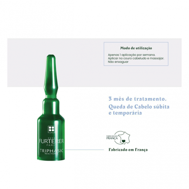 Aplicar 1 ampola de Rene Furterer Triphasic Ampolas Antiqueda Reacional, 1 vez por semana, no cabelo e couro cabeludo, secção a secção, após a lavagem, com uma massagem suave para melhor absorção. Não enxaguar. O tratamento tem a duração de 3 meses, sendo que uma embalagem dá para completar o tratamento.