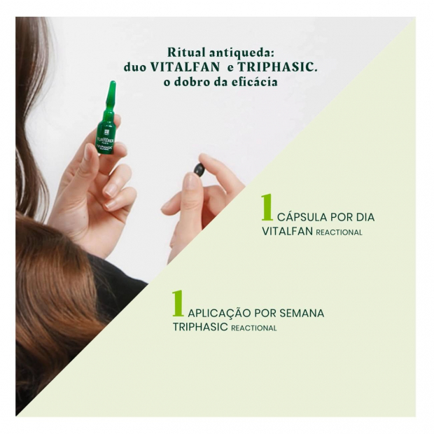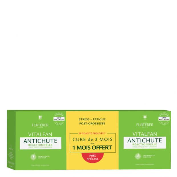 René Furterer Vitalfan Queda Reacional é um suplemento alimentar desenvolvido para travar a queda reacional, pontual, mas intensa, causada por alterações fisiológicas ou emocionais (stress, intervenção cirúrgica, pós parte ou depressão).