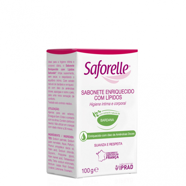 Saforelle Sabonete Higiene Íntima tem um pH alcalino suave e uma fórmula rica em lípidos, com extratos naturais de bardana e óleo de amêndoas doces que proporcionam suavidade, nutrição e mantém o equilíbrio natural da pele e mucosas.